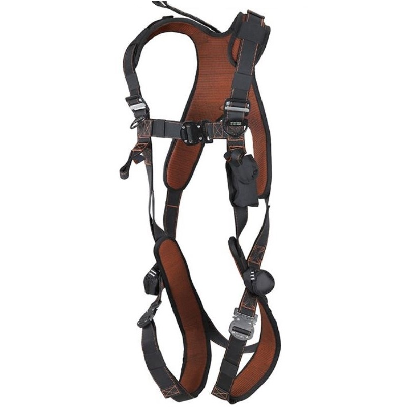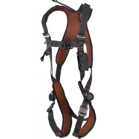 Punkt kotwienia: grzbietowy i mostkowy. Pas, który jest przedłużeniem punktu kotwienia, pętla do mocowania mostkowego, automatyczne sprzączki do szybkiego uwalniania.